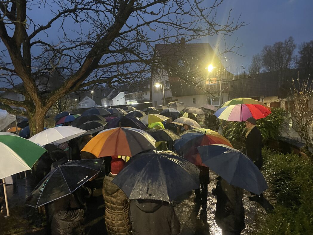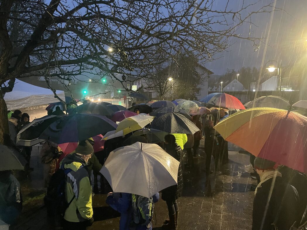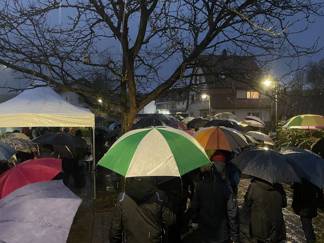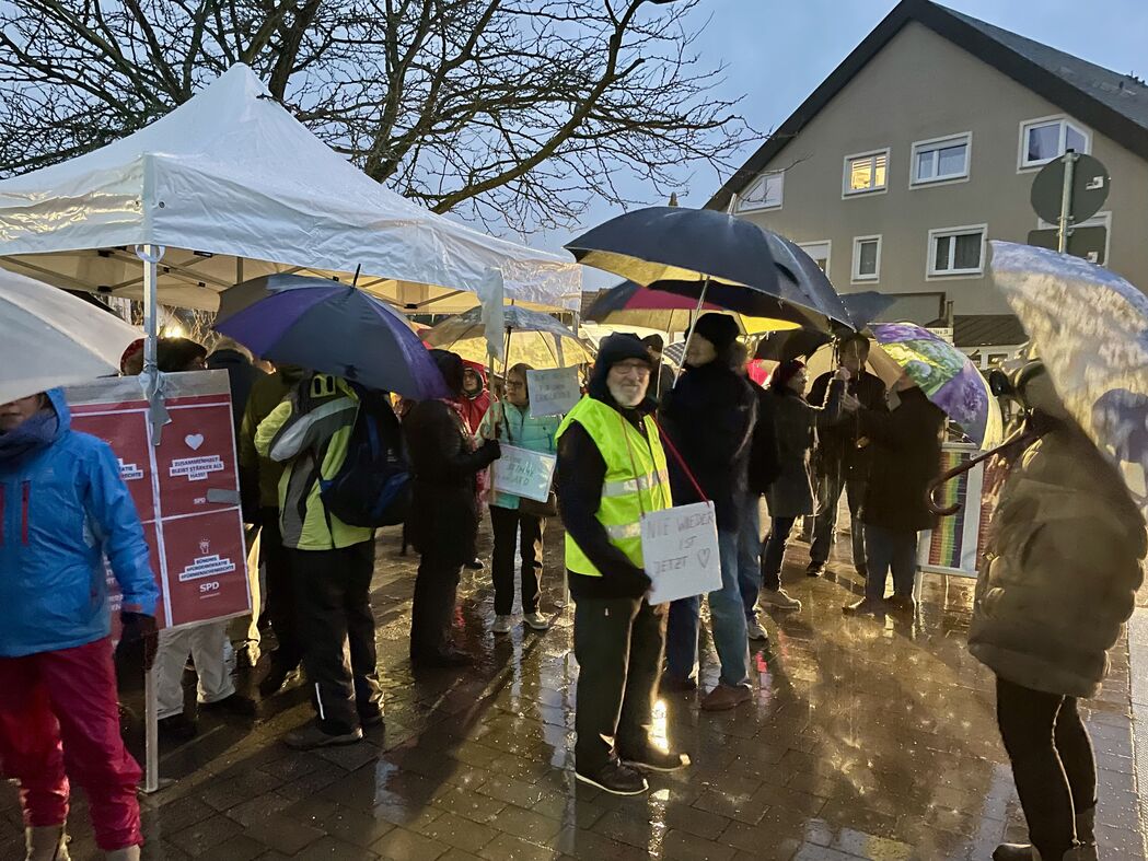 Der Vorsitzende des Wiesenbacher SPD-OV, Jürgen Berger, rief am Sonntagabend in einer Pressemitteilung kurzfristig dazu auf, sich am folgenden Montag zu einer "demonstrativen Kundgebung aller Demokraten gegen die von großen Teilen der AfD vertretene Nazi-Ideologie" zu versammeln. Trotz des spontanen Charakters des Aufrufs fanden sich erstaunlich viele Menschen auf dem Wiesenbacher Rathausplatz ein, um gegen rassistische und nationalistische Ideologien zu protestieren. Mit selbst beschrifteten Plakaten zeigten die etwa 100 Teilnehmerinnen und Teilnehmer trotz stömenden Regens ein klares Bekenntnis zu unserer Demokratie. Der Regenschirm wurde zum Symbol des gemeinsamen Engagements für eine demokratische Gesellschaft.